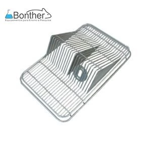 Tampas em arame de ferro com tratamento de zincagem ou aço inox Aisi 304, com eletropolimento. Medidas aproximadas de 30,4 x19,3cm, malha de 0,5cm com 21 fios de arames paralelos, comedouro embutido em V, com laterais triangulares fixas e divisória interna basculante para separar o comedouro do bebedouro, uma arruela fixa para proteção da rolha e encaixe do bebedouro.